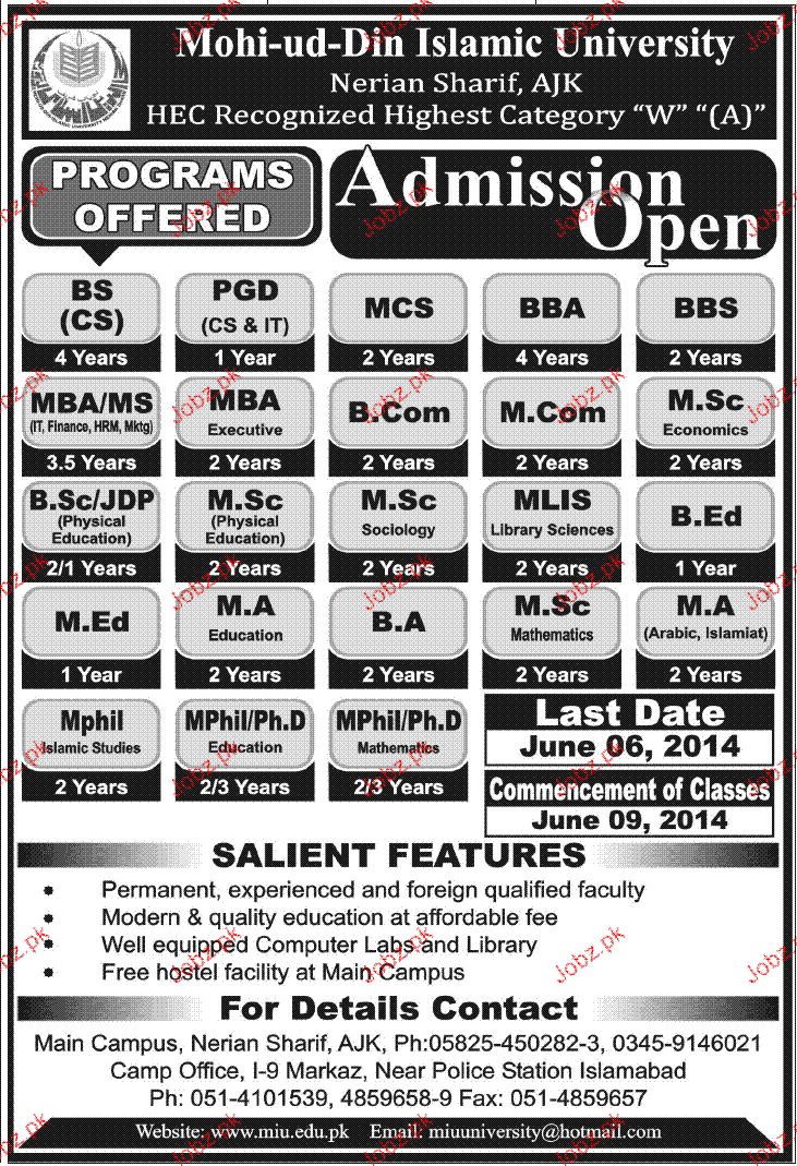 Mohi-ud-Din Islamic University Admission in BS, PGD, BBA, MBA, MSc, MLIS, BEd, MA, MED, Mphill and Phd in Islamabad. Read newspaper ad for exact details.