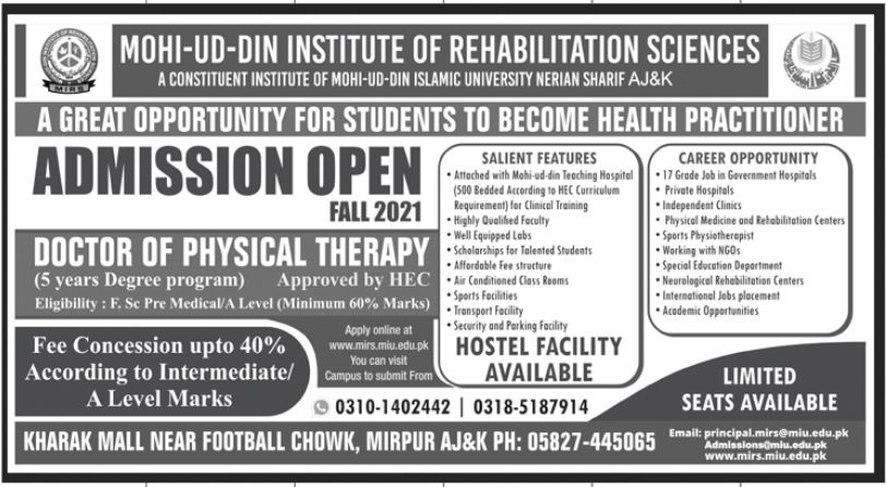 Mohi ud Din Institute of Rehabilitation Sciences A Constituent Institute of Mohi ud Din Islamic University has announced admission in Doctor of Physical Therapy DPT 5 Years Degree Program 2021. Read newspaper ad for exact details.