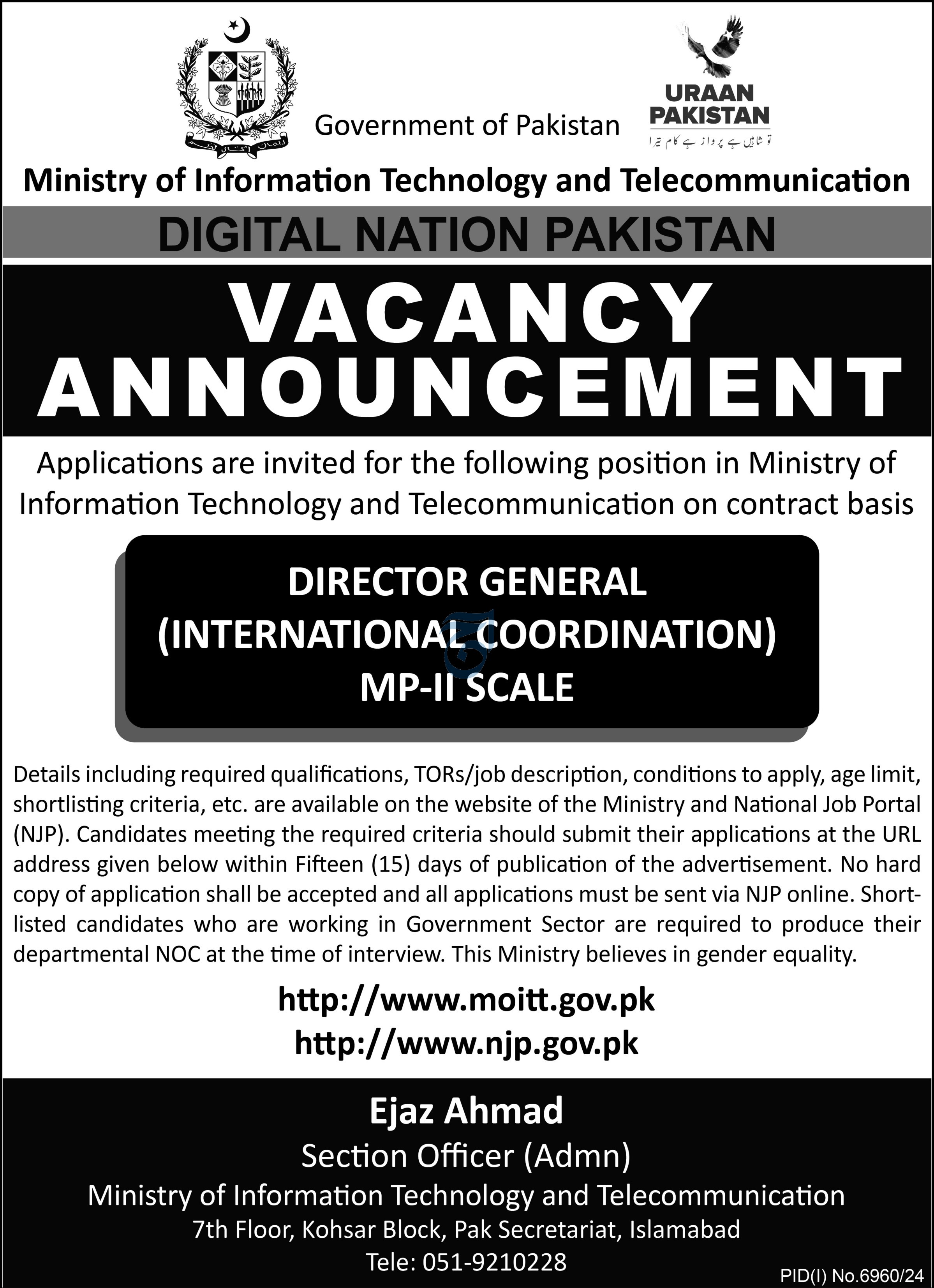 Ministry of Information Technology & Telecommunication MOIT invites applications for job positions advertised in daily Aaj dated 14 April 2025 for following vacancies in Islamabad, islamabad Islamabad Pakistan.