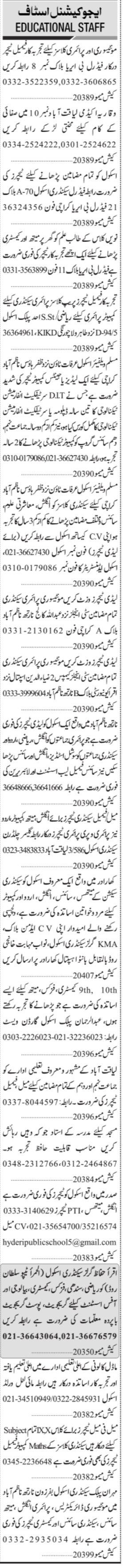 Educational Institute jobs advertisement dated about 8 August 2022 in daily Jang Newspaper invites application for the vacant post of urdu teacher, english teacher, chemistry teacher, teacher, physics teacher, pak studies teacher, montessori teacher, primary teacher, bio teacher and islamiat teacher in Karachi, karachi Sindh Pakistan. M.ed, Bachelor, MA, B.ed, M.sc, Master and BA etc. educational qualification will be preferred.