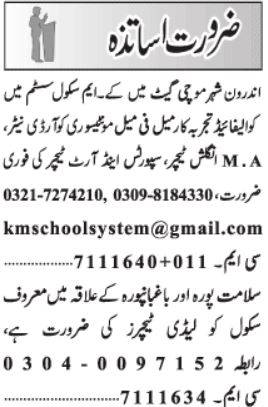 Private School invites applications for job positions advertised in daily Jang dated 14 January 2022 for following vacancies in Lahore Punjab Pakistan.