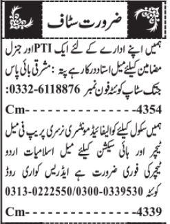 Private School invites applications for job positions advertised in daily Jang dated 15 March 2024 for following vacancies in Quetta, quetta Balochistan Pakistan.