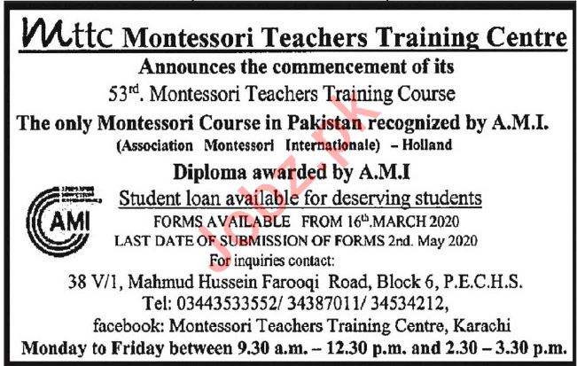 Montessori Teachers Training Centre MTTC is a private institution has announced admissions Montessori Course & Diploma in Karachi Sindh Pakistan 2020. Read newspaper ad for exact details.