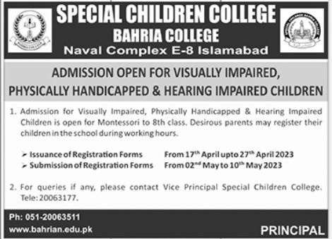Bahria College Montessori to 8th Class admissions 2023 has been announced. Students can enroll for admissions in Bahria College Islamabad Islamabad Pakistan for academic year 2023 to continue campus based or online education in Management College. Students who want to enroll for academic session 2023 in Primary and Middle qualification and admission criteria for Private institute can apply till last date 27 April 2023. Read newspaper ad for exact details.