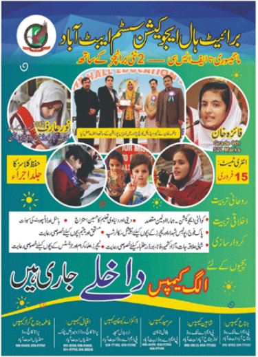 Bright Hall Education System Montessori to FSc Classes admissions 2023 has been announced. Eligible students can apply for academic admissions 2023 in Bright Hall Education System Abbottabad Khyber Pakhtunkhwa KPK Pakistan for Science College. Eligible students for fulfilling criteria for admissions in Primary, Intermediate, Middle and Matric can enroll as per Private admission policy 2023 till closing date 26 April 2023. Read newspaper ad for exact details.