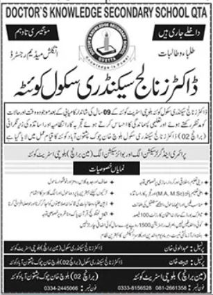 Doctors Knowledge Secondary School Matric admissions 2025 has been started. Eligible students who qualify as per admission criteria in Doctors Knowledge Secondary School Quetta Balochistan Pakistan can apply in Science School for academic year 2025. Eligible candidates for admissions in can apply as per Private institute criteria and before closing date 31 March 2025 after reading advertisement online Read newspaper ad for exact details.