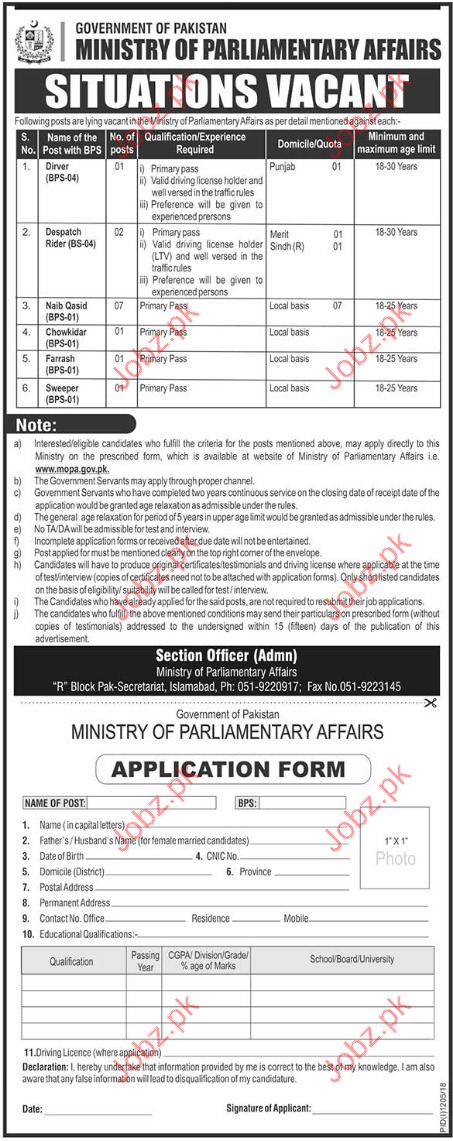 Latest Ministry of Parliamentary Affairs MOPA Driving Posts Islamabad 2025