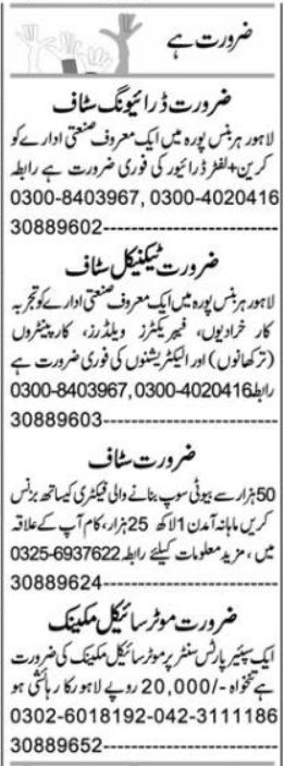 Private Company Lahore, lahore Punjab Pakistan invites applications from eligible candidates for the post of lifter driver, welder, lathe machine operator, factory worker, ltv driver, carpenter, fabricator, crane driver, electrician, motorcycle mechanic and driver as per advertisement of August 22, 2024 published in daily Express Newspaper. Persons with Matric, DAE, Intermediate, Bachelor, BA and Middle etc. education can apply.