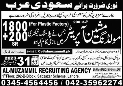 Al Muzammil Recruitment Agency jobs advertisement dated about 31 December 2023 in daily Express Newspaper invites application for the vacant post of moulding machine operator in Makkah, makkah Saudi Arabia. Educational qualifications required Matric etc.