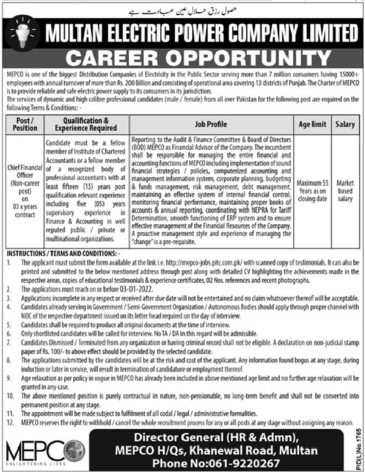 Vacancies in Multan Electric Power Company MEPCO Advertisement December 2021