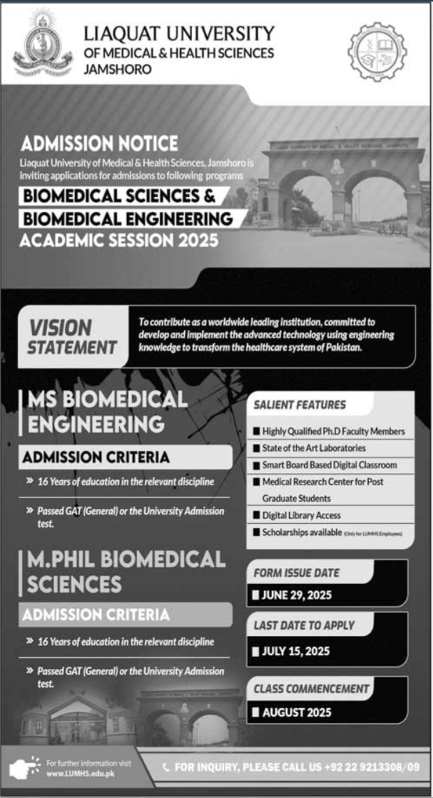 Admissions in Liaquat University of Medical & Health Sciences 2025 for mphil has been announced. Eligible students who qualify as per admission criteria in Liaquat University of Medical & Health Sciences Karachi Sindh Pakistan can apply in Science University for academic year 2025. Students who want to enroll for academic session 2025 in qualification and admission criteria for Government institute can apply till last date. Read newspaper ad for exact details.