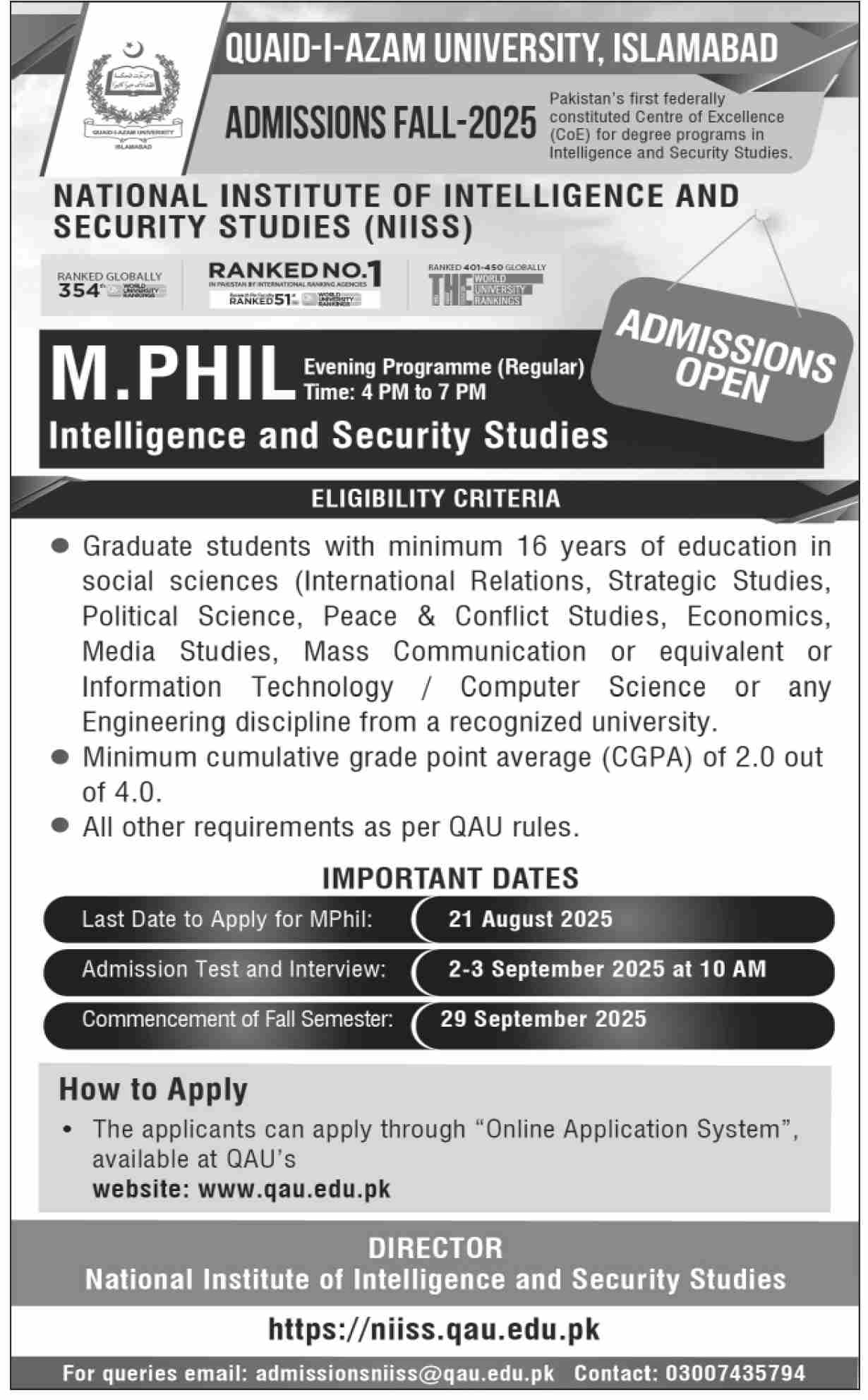MPHIL Admissions 2025 open in Quaid e Azam University