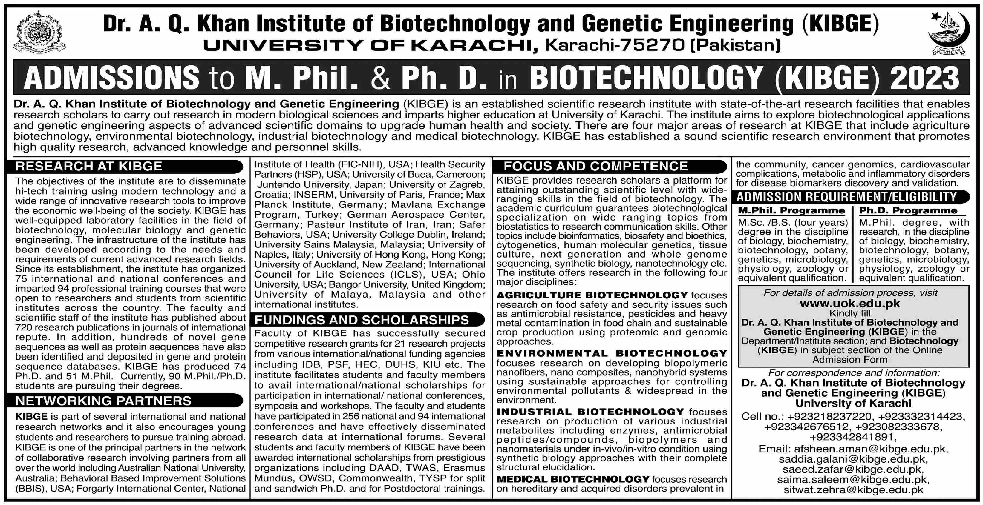 MPhil and PhD admissions at Dr A Q Khan Institute of Biotechnology