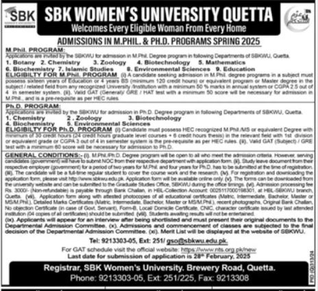 Sardar Bahadur Khan Women University SBKWU has announced admissions 2025 for MPHIL, PHD. Eligible students who qualify as per admission criteria in Sardar Bahadur Khan Women University SBKWU Quetta Balochistan Pakistan can apply in Science University for academic year 2025. Students for admissions in can apply for online or campus classes as per Government institute criteria till admission closing date. Read newspaper ad for exact details.