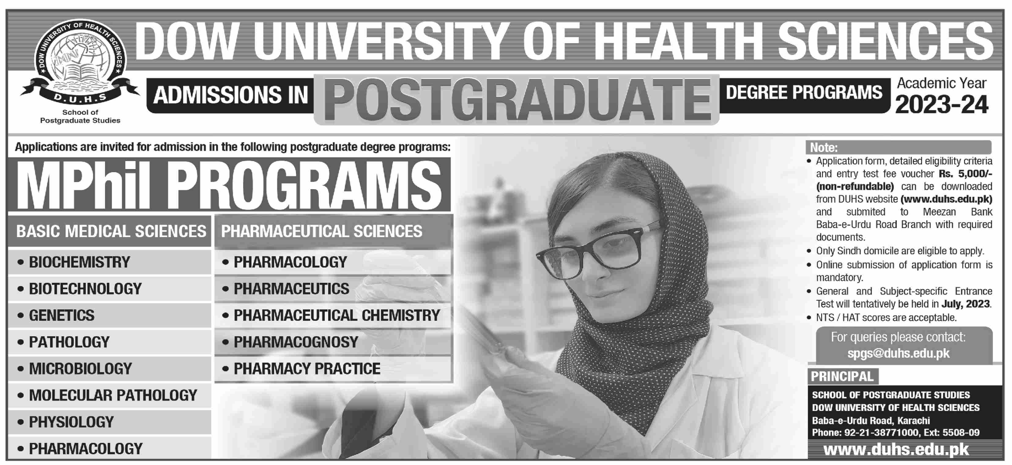 Dow University of Health Sciences has announced admissions 2023 for MPhil Biochemistry, MPhil Biotechnology, MPhil Genetics, MPhil Pathology, MPhil Microbiology, MPhil Molecular Pathology, MPhil Physiology, MPhil Pharmacology, MPhil Pharmacology, MPhil Pharmaceutics . Dow University of Health Sciences Karachi Sindh Pakistan welcomes students to apply for admissions in academic year 2023 in Medical University. Eligible candidates for admissions in Mphil can apply as per Private institute criteria and before closing date 30 May 2023 after reading advertisement online. Read newspaper ad for exact details.