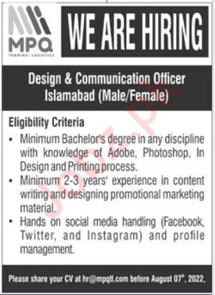 MPQ Trading & Logistics invites applications for job positions advertised in daily Jang dated 31 July 2022 for following vacancies in Islamabad, islamabad Islamabad Pakistan.