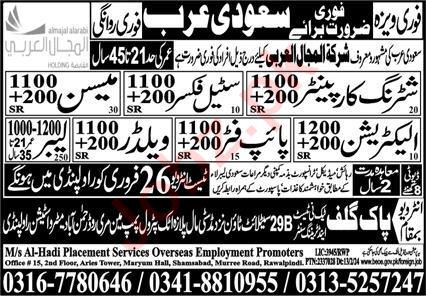 MS Al Hadi Placement Services Overseas Employment Promoters jobs advertisement dated about 26 February 2024 in daily Express Newspaper invites application for the vacant post of labor, pipe fitter, mason, electrician, shuttering carpenter, steel fixer and welder in Riyadh, riyadh Saudi Arabia. Candidates with Matric, Middle and Primary etc. educational background will be preferred.