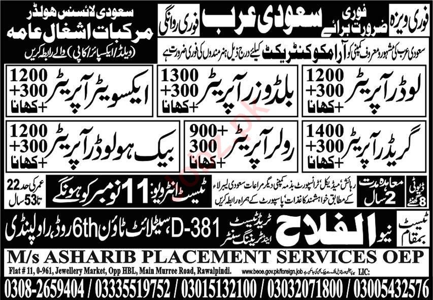 MS Asharib Placement Services OEP is looking for candidates for following posts as per job advertisement published in daily Express Newspaper of November 6, 2023 for location Riyadh, riyadh Saudi Arabia: