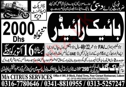 MS Citrus Services Dubai, dubai Dubai invites applications from eligible candidates for the post of bike rider as per advertisement of October 15, 2023 published in daily Express Newspaper. Matric, Middle and Primary etc. educational qualification will be preferred.