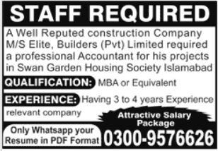 Latest Elite Builders Pvt Ltd Accounting Posts Islamabad 2025