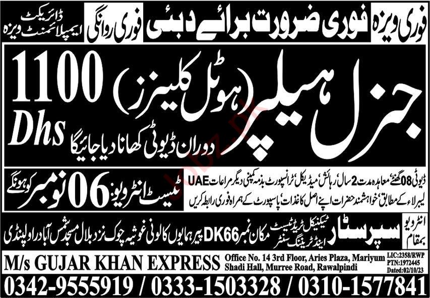 MS Gujar Khan Express jobs advertisement dated about 6 November 2023 in daily Express Newspaper invites application for the vacant post of general helper in Dubai, dubai Dubai. Candidates with Middle, Matric and Primary etc. educational background will be preferred.