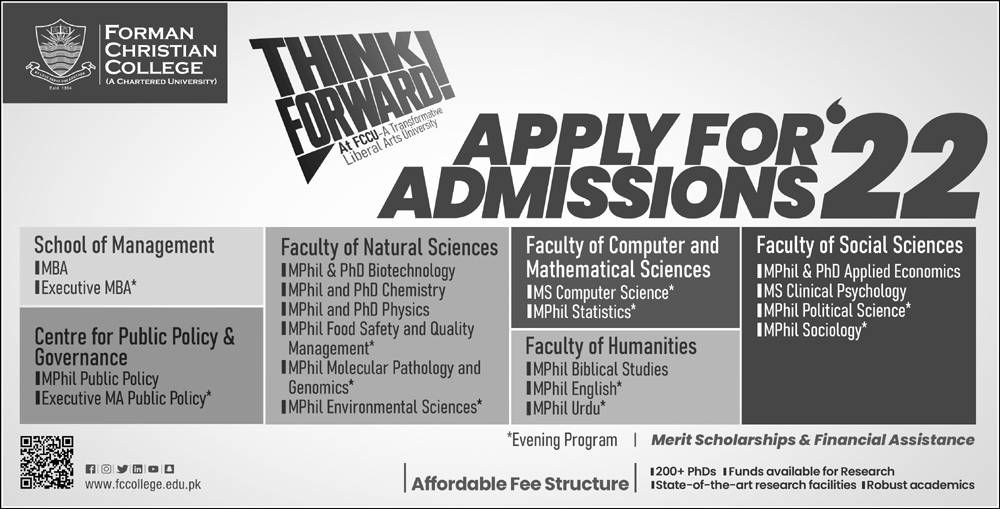 Forman Christian College MBA, Executive MBA, MS, MPhil admissions 2022 has been started. Students can enroll for admissions in Forman Christian College Lahore Punjab Pakistan for academic year 2022 to continue campus based or online education in Science College. Eligible students for fulfilling criteria for admissions in MS, MA, MBA and Mphil can enroll as per Private admission policy 2022 till closing date 24 August 2022. Read newspaper ad for exact details.