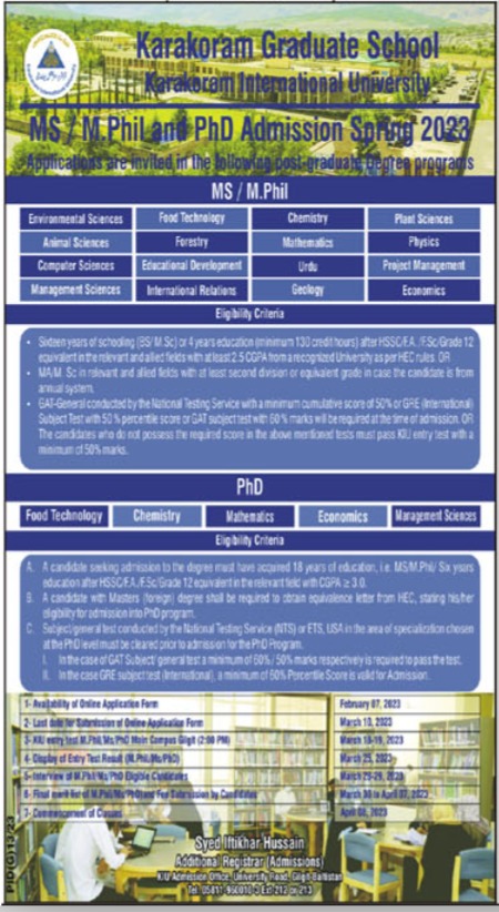 Karakoram International University MS, MPhil, PhD admissions 2023 has been announced. Students can enroll for admissions in Karakoram International University Gilgit Gilgit Baltistan Pakistan for academic year 2023 to continue campus based or online education in Science University. Students who want to enroll for academic session 2023 in MS, Phd and Mphil qualification and admission criteria for Private institute can apply till last date 10 March 2023. Read newspaper ad for exact details.