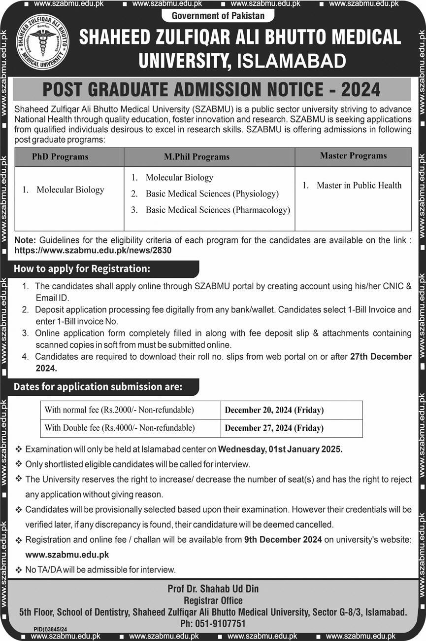 Shaheed Zulfiqar Ali Bhutto Medical University SZABMU MS, MPhil, PhD admissions 2024 has been started. Shaheed Zulfiqar Ali Bhutto Medical University SZABMU Islamabad Islamabad Pakistan welcomes students to apply for admissions in academic year 2024 in Medical University. Students who want to enroll for academic session 2024 in MS, Phd and Mphil qualification and admission criteria for Government institute can apply till last date 20 December 2024. Read newspaper ad for exact details.