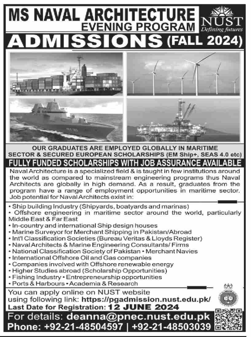 National University of Sciences & Technology NUST has announced admissions 2024 for MS Naval Architecture. Eligible students who qualify as per admission criteria in National University of Sciences & Technology NUST Karachi Sindh Pakistan can apply in Science University for academic year 2024. Eligible candidates for admissions in MS can apply as per Government institute criteria and before closing date 12 June 2024 after reading advertisement online. Read newspaper ad for exact details.