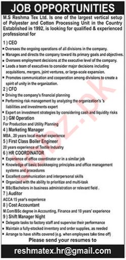 MS Reshma Tex Ltd Lahore, lahore Punjab Pakistan invites applications from eligible candidates for the post of auditor, gm operation, ceo, shift manager night, cost accountant, gm operator, cfo and hr coordinator as per advertisement of December 10, 2023 published in daily The News Newspaper. Preferred Education is Bachelor, B.com, MS, BBA and Master etc.