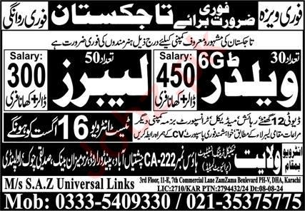 MS SAZ Universal Links jobs advertisement dated about 12 August 2024 in daily Express Newspaper invites application for the vacant post of welder and labor in Dushanbe, dushanbe Tajikistan. Candidates with Middle and Matric etc. educational background will be preferred.