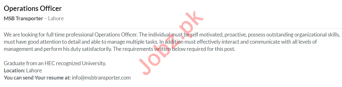 MSB Transporter Lahore Job 2020 For Operation Officer