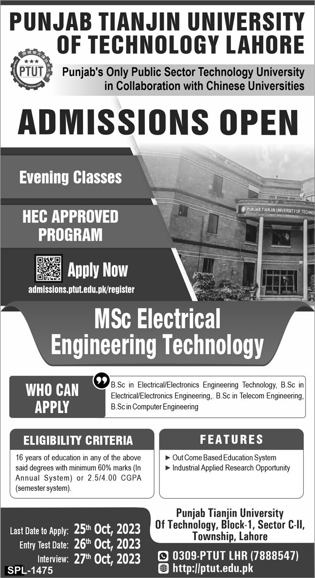 Punjab Tianjin University of Technology PTUT MSc Electrical Engineering admissions 2023 has been announced. Eligible students who qualify as per admission criteria in Punjab Tianjin University of Technology PTUT Lahore Punjab Pakistan can apply in Engineering University for academic year 2023. Eligible students for fulfilling criteria for admissions in Master, M.sc and ME can enroll as per Government admission policy 2023 till closing date 25 October 2023. Read newspaper ad for exact details.