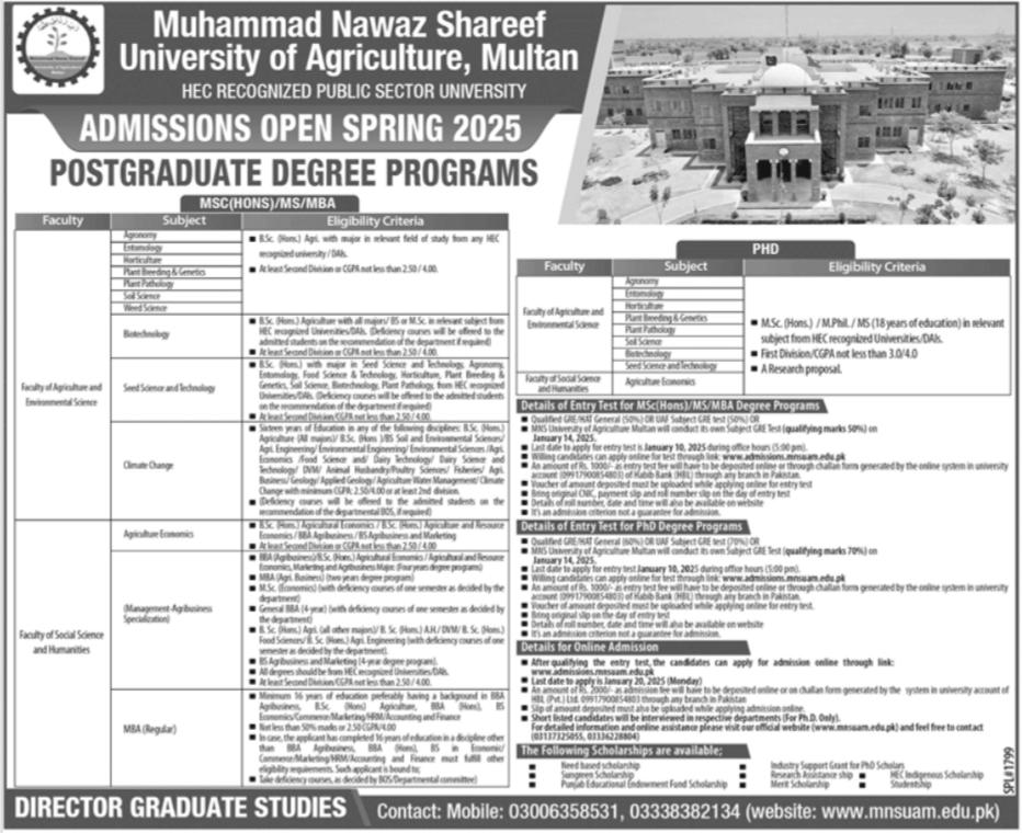 Muhammad Nawaz Shareef University of Agriculture MSc, MS, MBA, PhD admissions 2024 has been announced. Eligible students can apply for academic admissions 2024 in Muhammad Nawaz Shareef University of Agriculture Multan Punjab Pakistan for Science University. Students who want to enroll for academic session 2024 in Phd, MBA, M.sc and MS qualification and admission criteria for Government institute can apply till last date 20 January 2025. Read newspaper ad for exact details.
