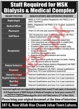Vacancies in MSK Dialysis & Medical Complex Advertisement November 2020