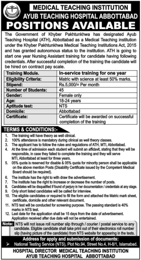 Vacant posts including nursing assistant are announced in Ayub Teaching Hospital Abbottabad, abbottabad Khyber Pakhtunkhwa KPK Pakistan as per 12 May 2022 advertisement in daily Aaj Newspaper. Preferred Education is Matric etc.