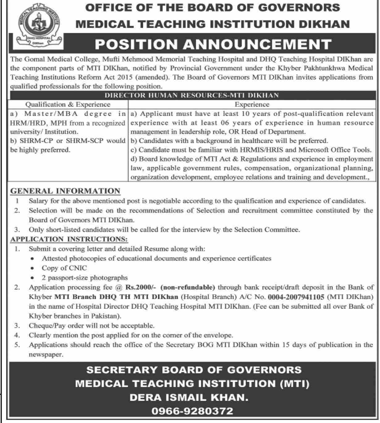Medical Teaching Institution MTI Dera Ismail Khan, dera ismail khan Khyber Pakhtunkhwa KPK Pakistan invites applications from eligible candidates for the post of director human resource as per advertisement of July 1, 2025 published in daily Dawn Newspaper. Bachelor, MS and Master etc. educational qualification will be preferred.