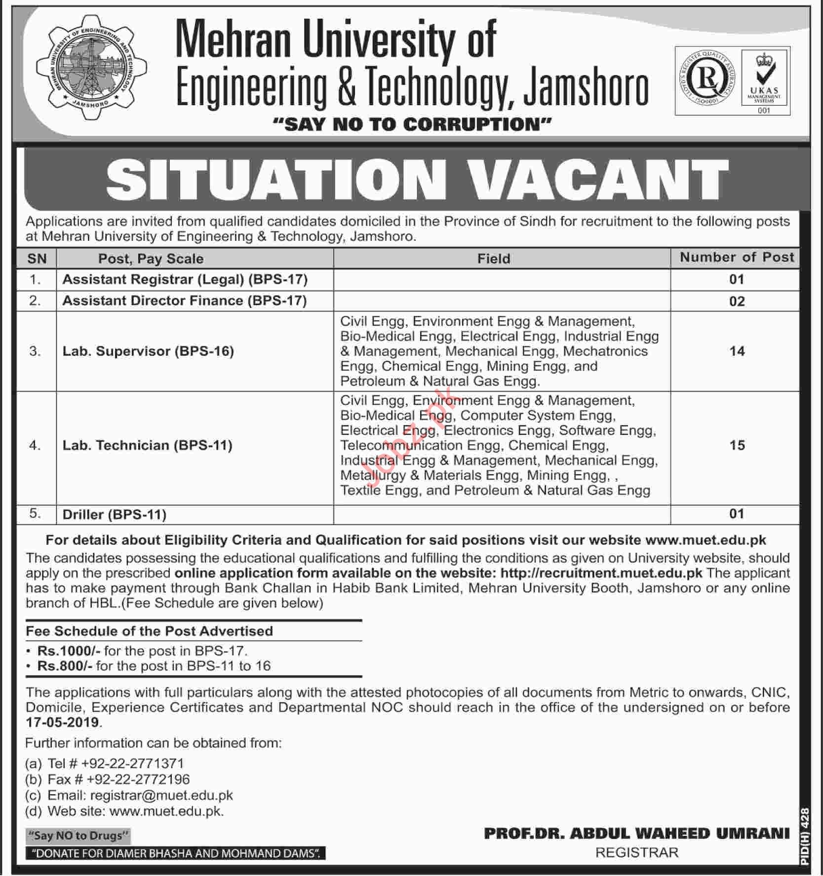 Vacancies in Mehran University of Engineering & Technology Advertisement April 2019