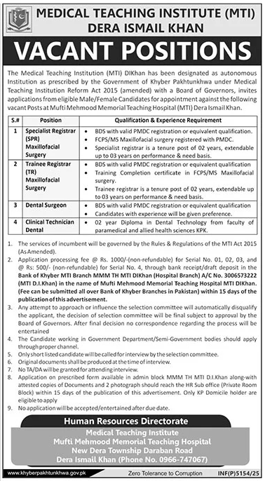 Mufti Mehmood Memorial Teaching Hospital, Medical Teaching Institution MTI jobs advertisement dated about 6 December 2025 in daily The News Newspaper invites application for the vacant post of clinical technician dental, trainee registrar maxillofacial surgery, specialist registrar maxillofacial surgery, dental surgeon, specialist registrar and trainee registrar in Dera Ismail Khan, dera ismail khan Khyber Pakhtunkhwa KPK Pakistan. Preferred Education is MS, DAE, BDS, Bachelor, Others and Intermediate etc.