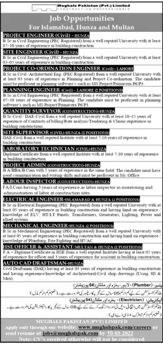 Mughals Pakistan Pvt Limited is looking for candidates for following posts as per job advertisement published in daily Jang Newspaper of February 27, 2022 for location Islamabad, hunza, islamabad, lahore and multan Islamabad Pakistan: