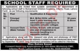 Muhammad Chadnan Academy Lahore, lahore Punjab Pakistan invites applications from eligible candidates for the post of accounts clerk and principal as per advertisement of August 21, 2022 published in daily Nation Newspaper. Candidates with Master, B.com and I.com etc. educational background will be preferred.