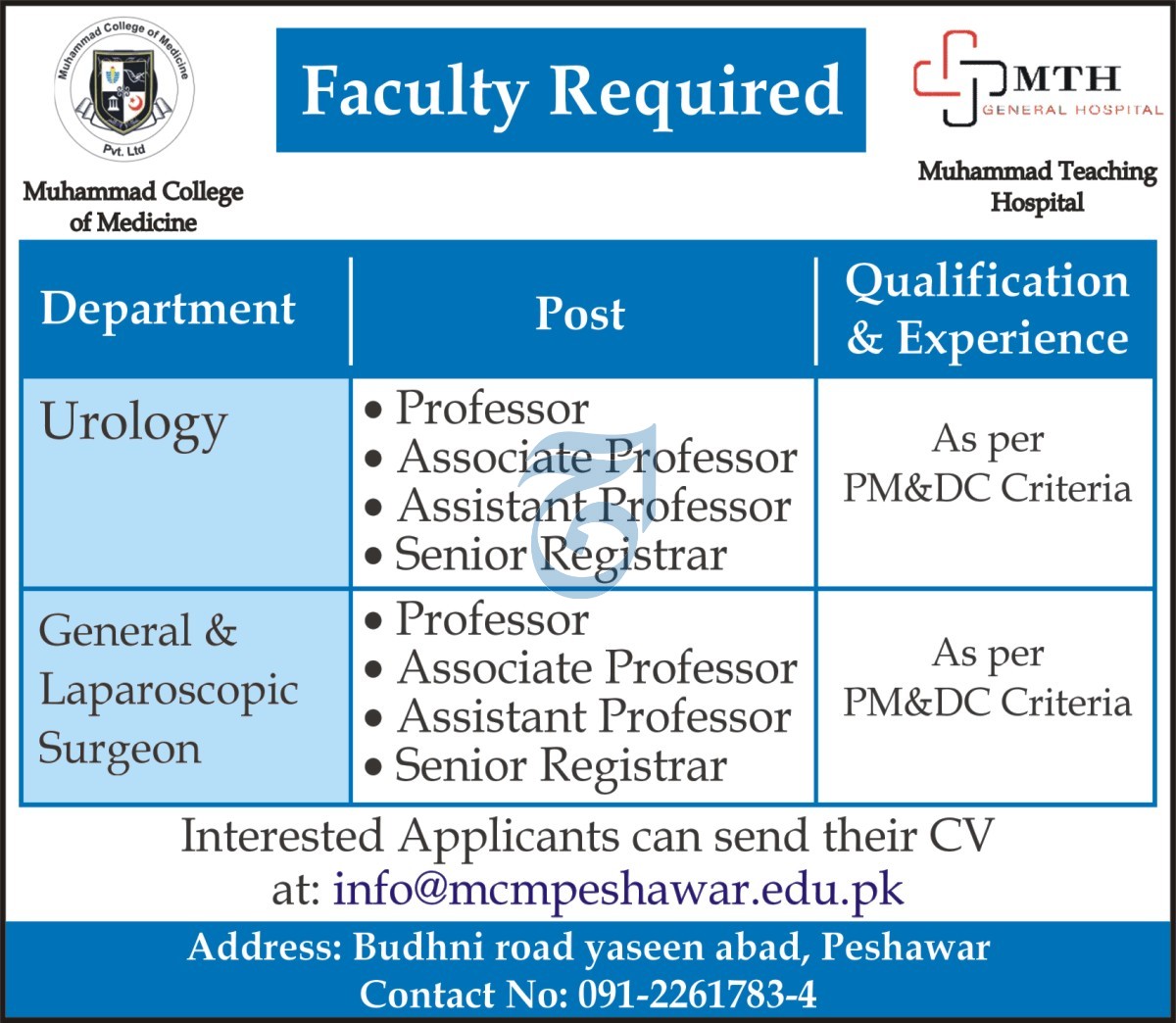 Muhammad Teaching Hospital MTH, Muhammad College of Medicine jobs advertisement dated about 1 October 2025 in daily Aaj Newspaper invites application for the vacant post of professor urology, associate professor, professor, professor laparoscopic surgeon, professor general surgeon, registrar and assistant professor in Peshawar, peshawar Khyber Pakhtunkhwa KPK Pakistan. MBBS and Others etc. educational qualification will be preferred.