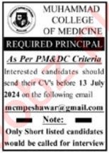 Muhammad College of Medicine jobs advertisement dated about 23 June 2024 in daily Mashriq Newspaper invites application for the vacant post of principal in Peshawar, peshawar Khyber Pakhtunkhwa KPK Pakistan. Persons with MS, Bachelor and Master etc. education can apply.
