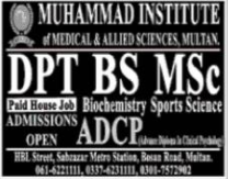 Muhammad Institute of Medical & Allied Sciences has announced admissions in Doctor of Physical Therapy DPT, BS Biochemistry, MSc Sports Science & ADCP. Read newspaper ad for exact details.