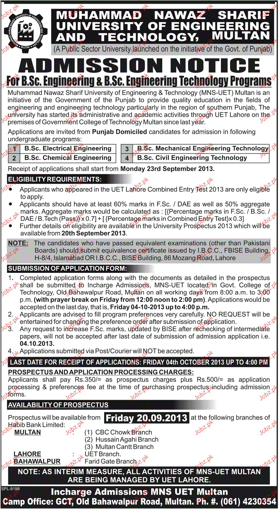 Muhammad Nawaz Sharif Universiry of Engineering & Technology Admission in BSc Engineering in Multan Read newspaper ad for exact details.