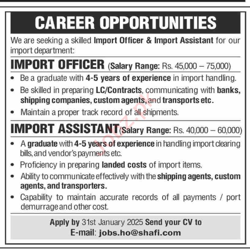 Vacant posts including import assistant and import officer are announced in Muhammad Shafi Tanneries Karachi, karachi Sindh Pakistan as per 12 January 2025 advertisement in daily Dawn Newspaper. Persons with Bachelor and Master etc. education can apply.