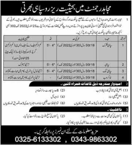 Mujahid Regiment Soldier Cook Clerk & Sweeper Jobs 2022