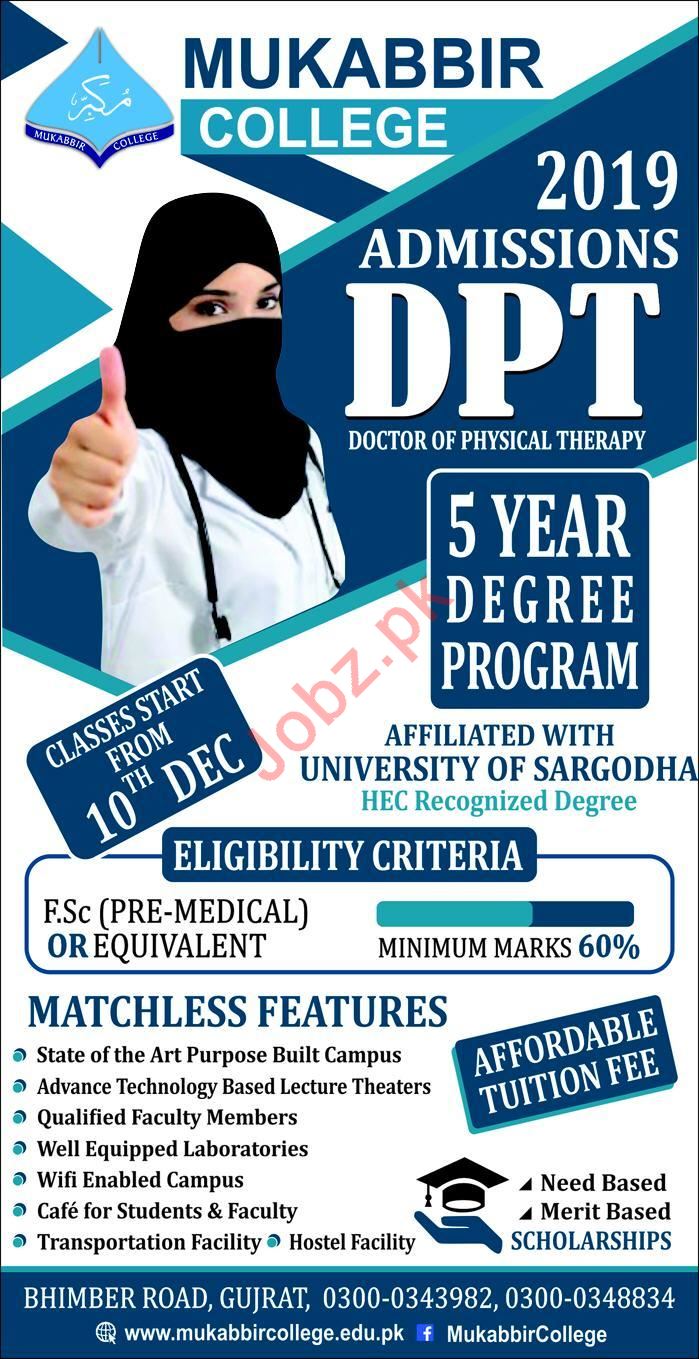 Mukabbir College Gujrat affiliated with University of Sargodha, Pakistan are announcing admissions winter 2020 for the classes of 5 Years Degree Program for DPT Doctor of Physical Therapy. Read newspaper ad for exact details.