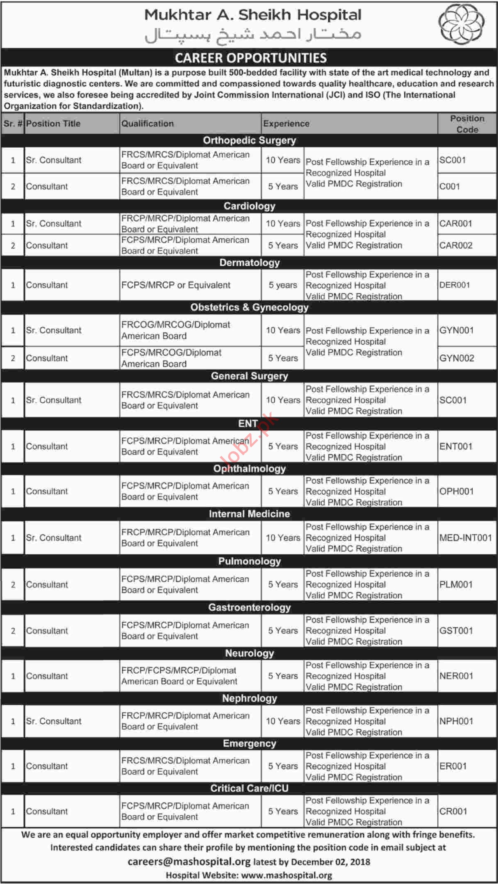 Vacancies in Mukhtar ASheikh Hospital Advertisement November 2018