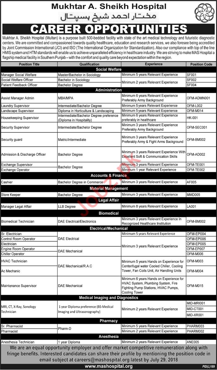 Mukhtar A Sheikh Memorial Welfare Hospital Multan, Pakistan seeks candidates for the posts of Manager Social Welfare, Patient Feedback Officer, Asst Manager Admin, Laundry Supervisor, Landscape Supervisor, Security Supervisor, Security Guards, Admission and Discharge Officer, Exchange Supervisor, Exchange Operator, Cashier and Manager Legal Affairs.